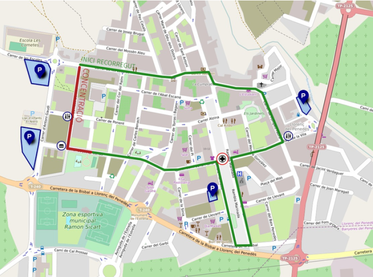 Recorregut: 17:30 h – c. Escoles, p. Anselm Clavé, c. Àngel Guimerà, c. Francesc Macià, p. Immaculada, c. Pompeu Fabra, p. de la Vila, Camí de la Plana, Rambla Marinada, Camí de la Plana, p. les Flors de Maig, c. Josep Cañas.